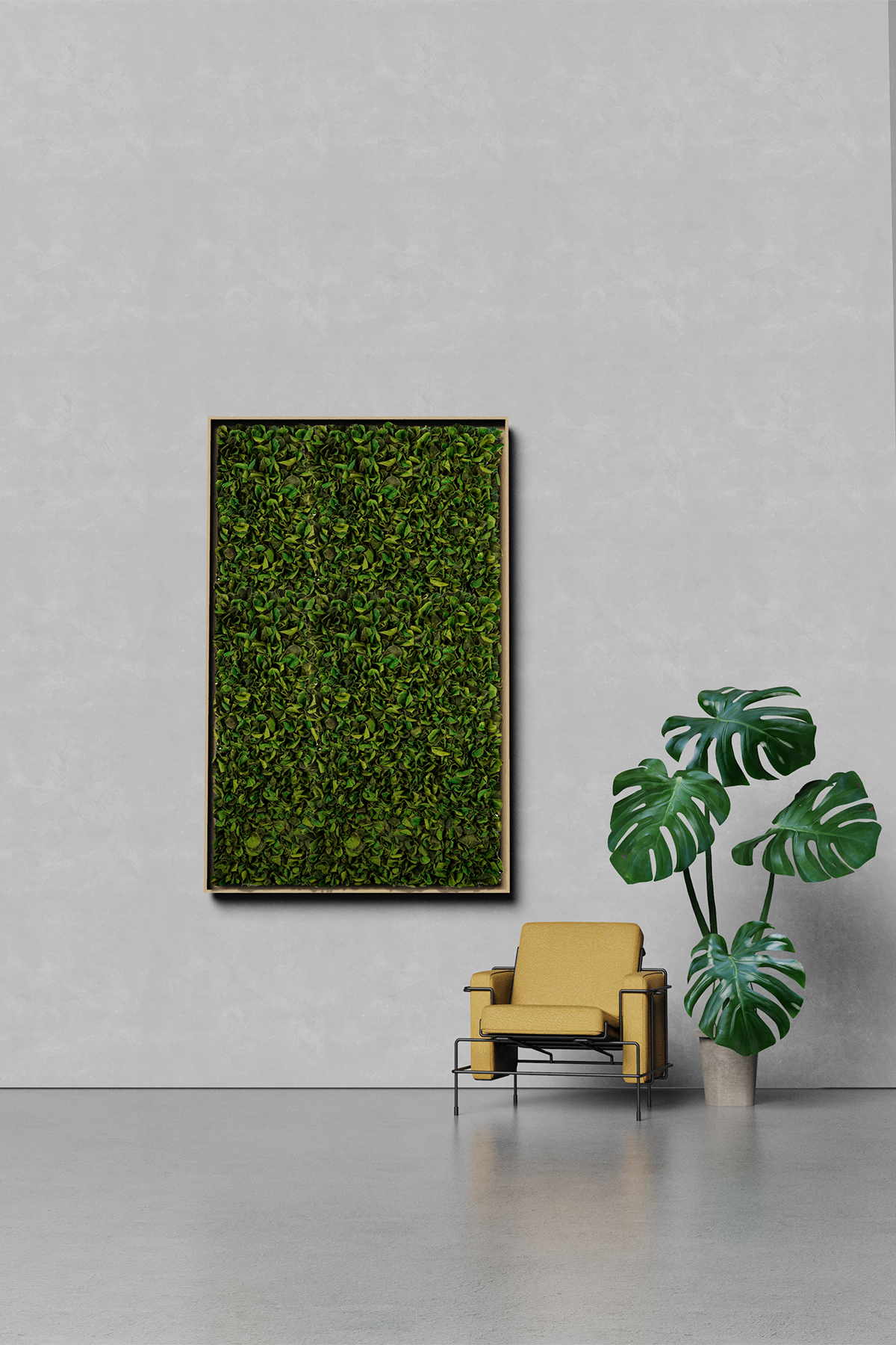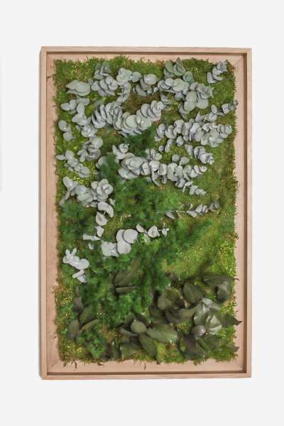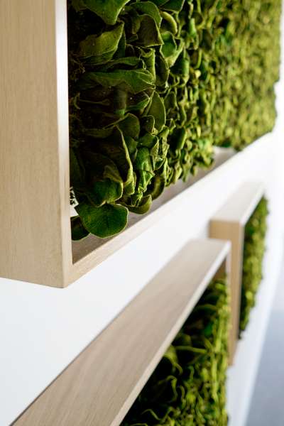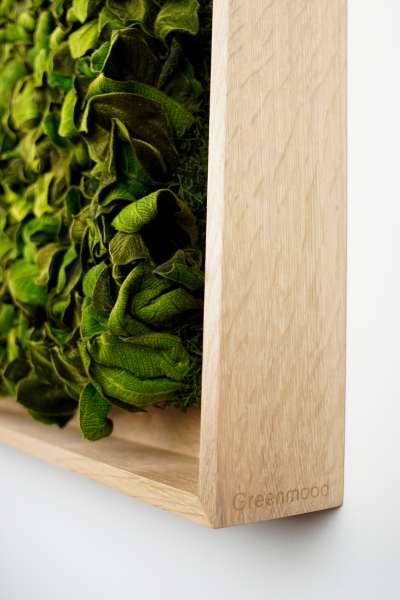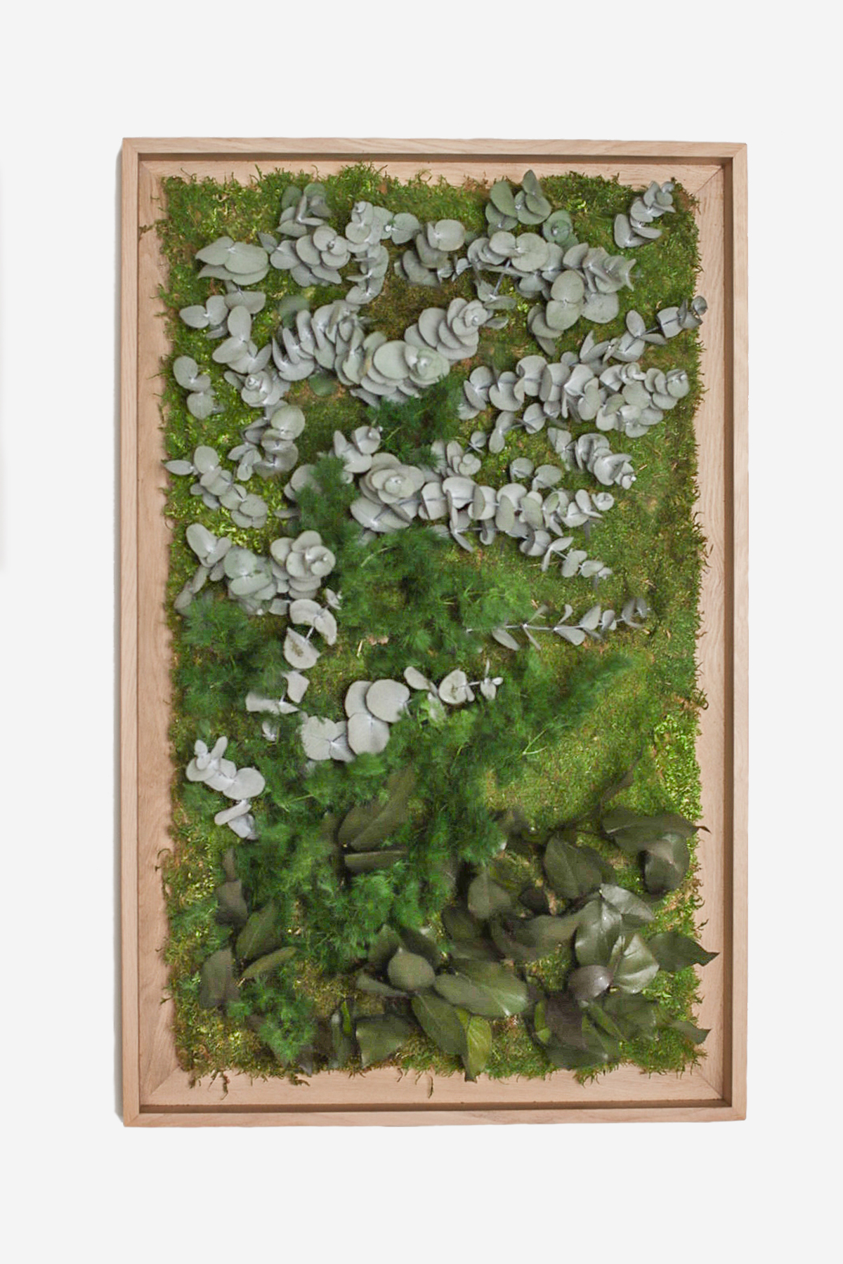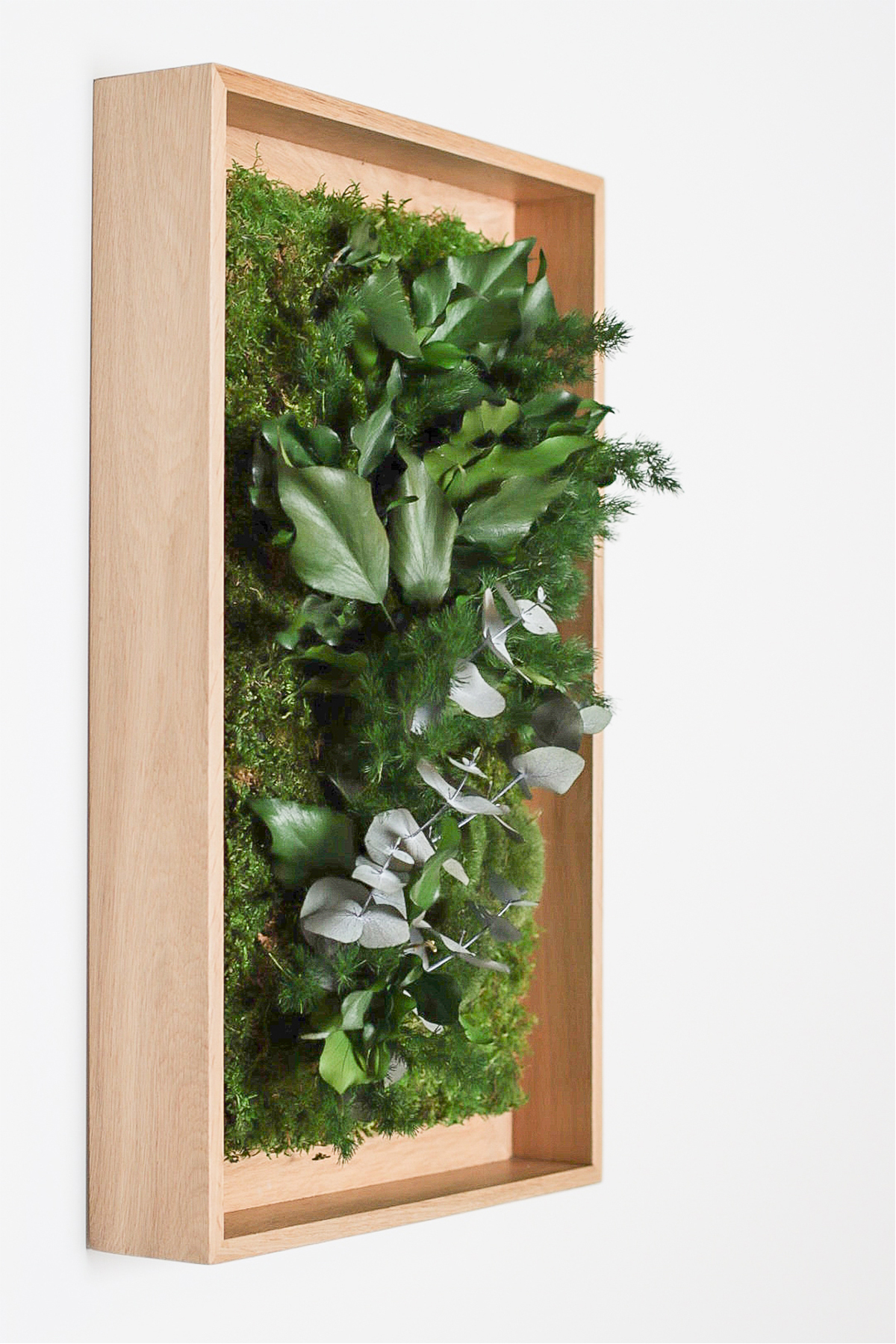 Organic, wild shapes of foliage, combined with the straight, defined lines of the oak frame bring to mind life breaking through strict, man-made limitations in order to restore the balance in our coexistence with nature.