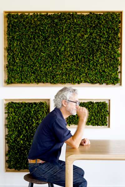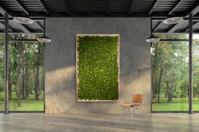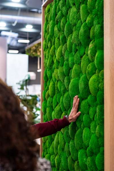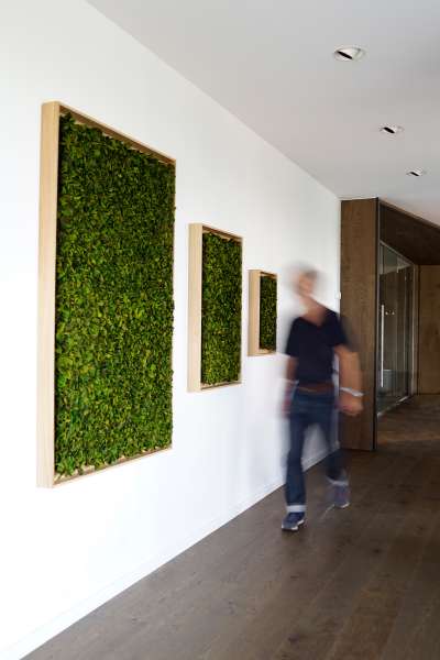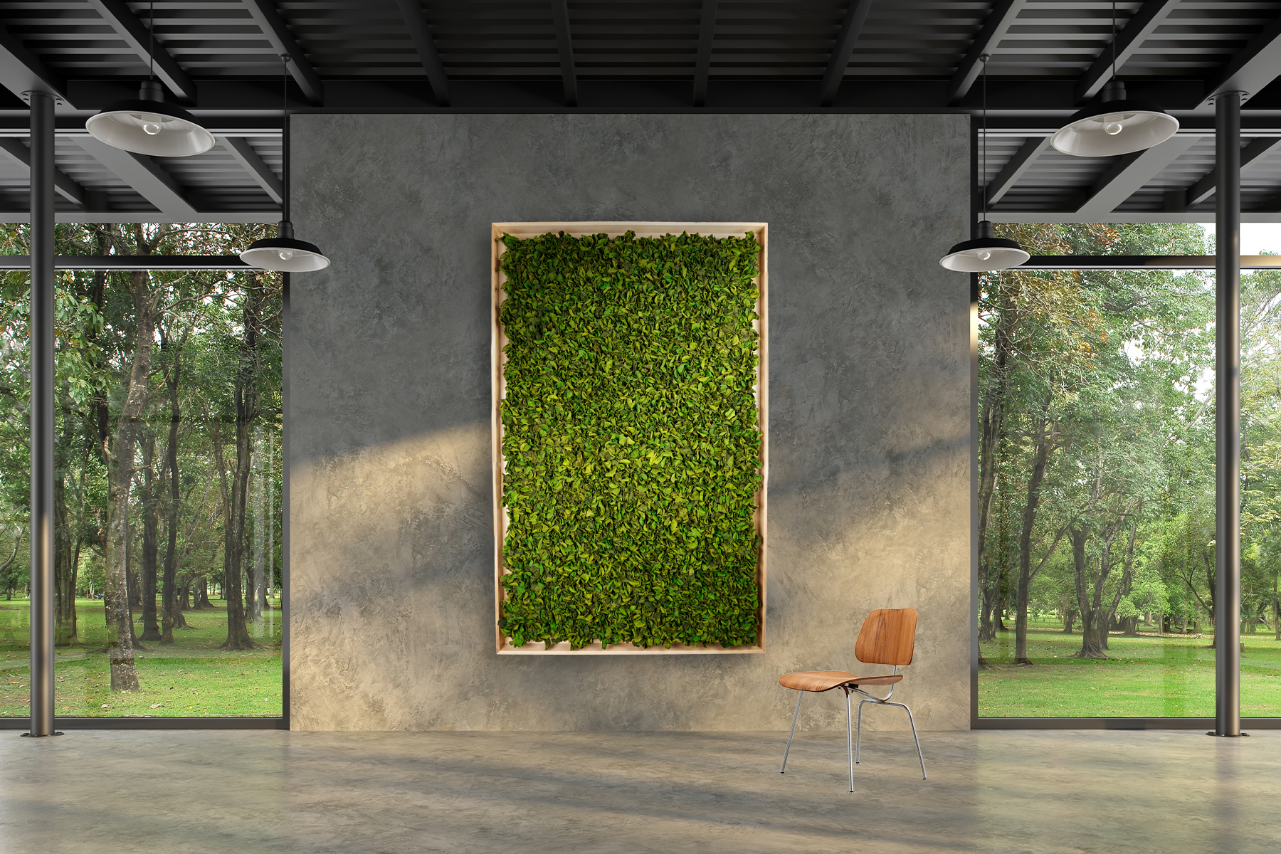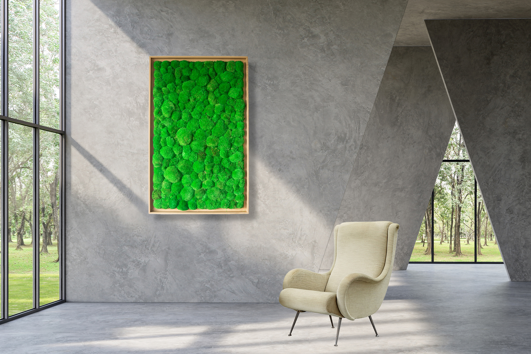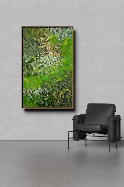 Organic, wild shapes of foliage, combined with the straight, defined lines of the oak frame bring to mind life breaking through strict, man-made limitations in order to restore the balance in our coexistence with nature.