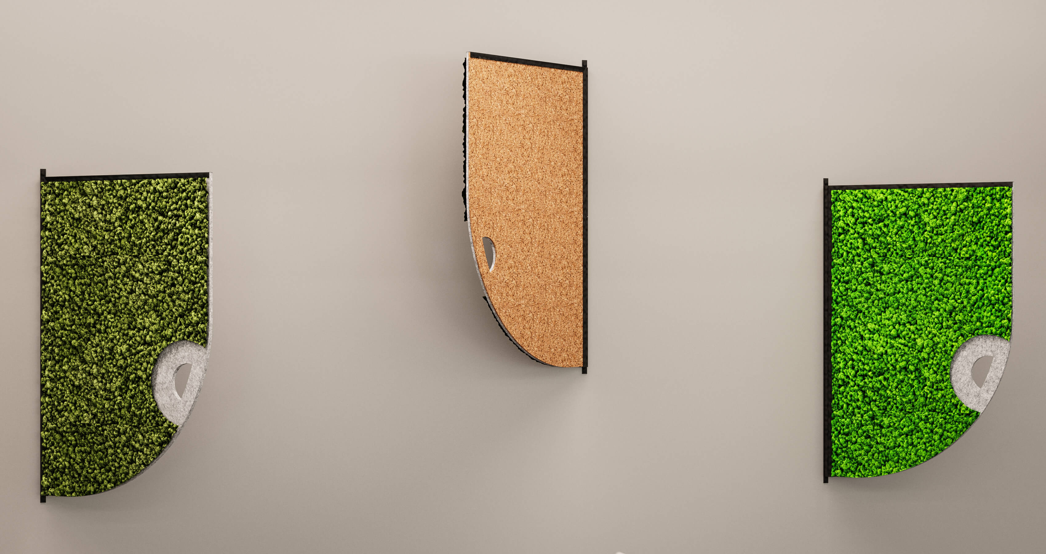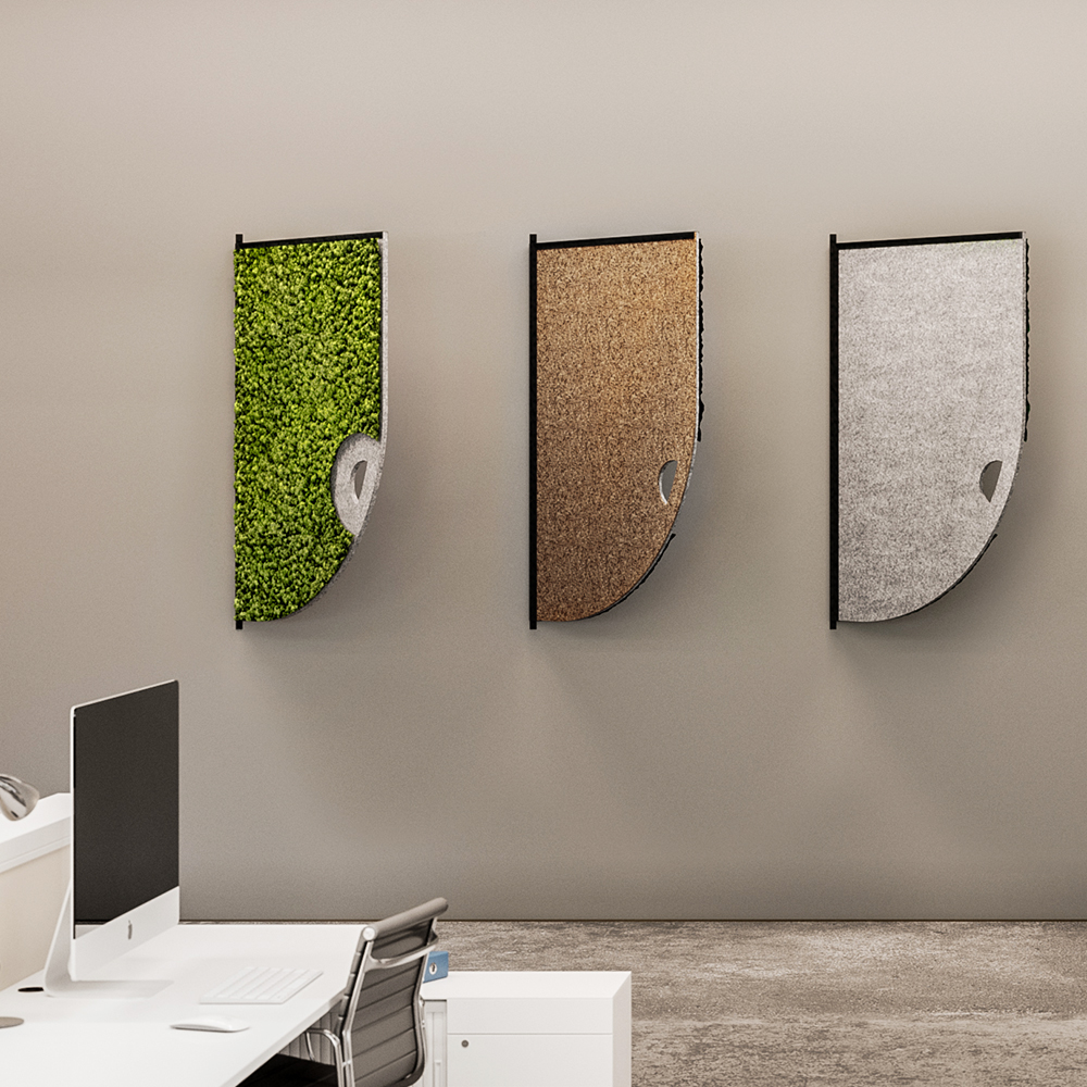 Comma is a decorative acoustic wall fixture ideal for corporate office spaces, hallways and lobbies. It features preserved moss on one side, and on the reverse, a choice of natural materials like cork and felt.