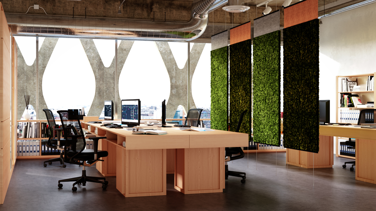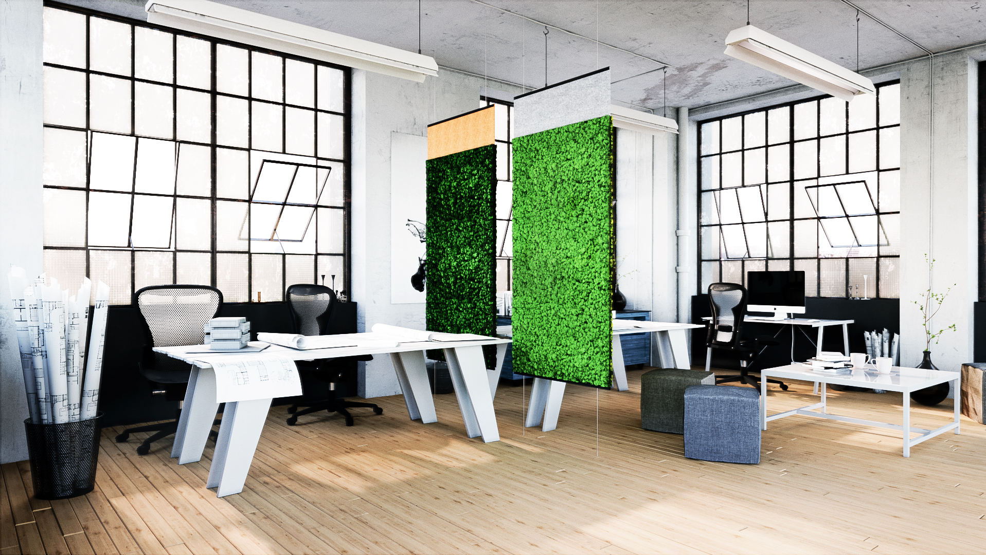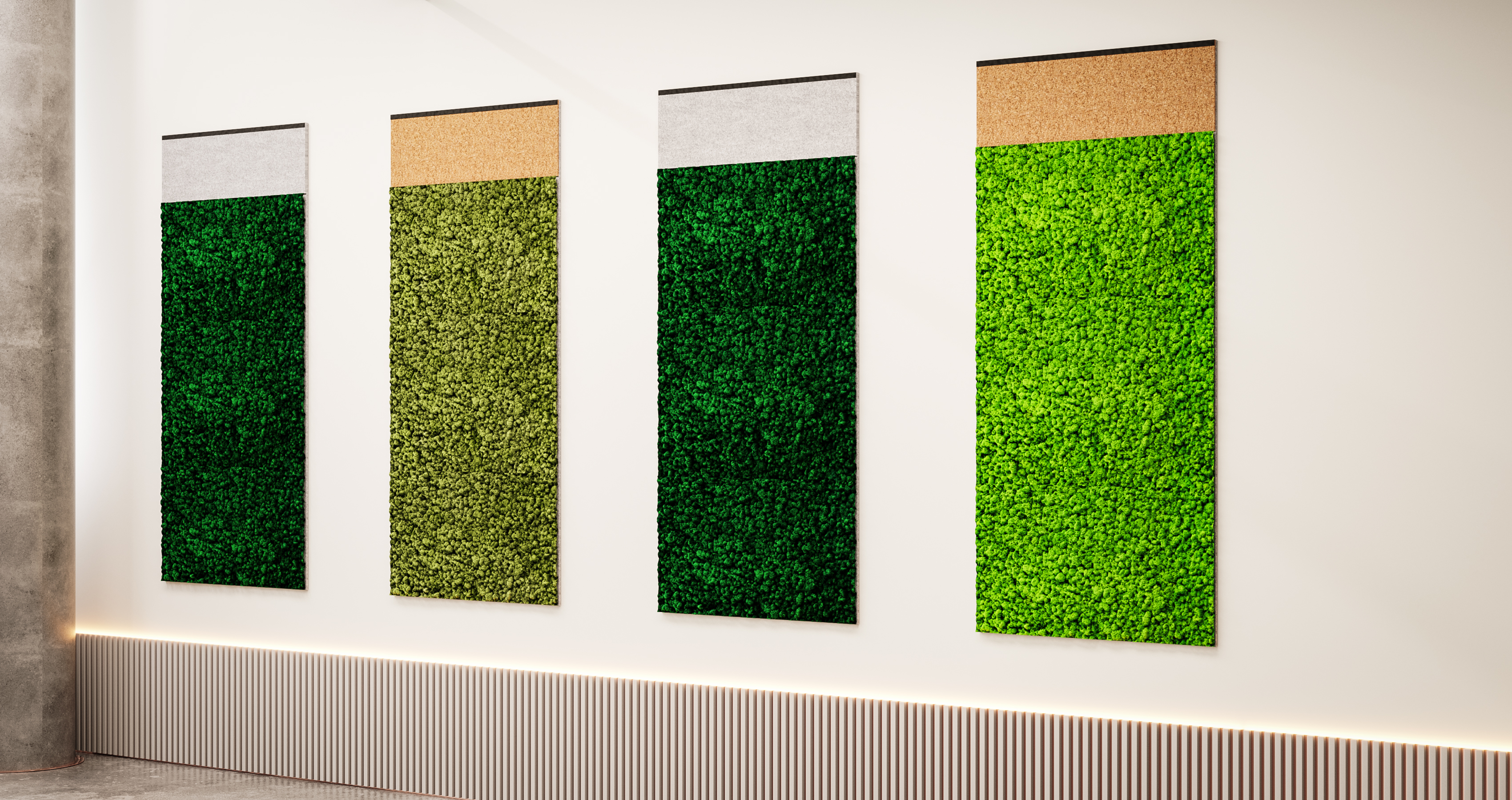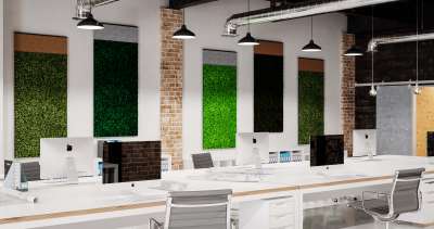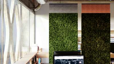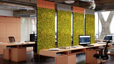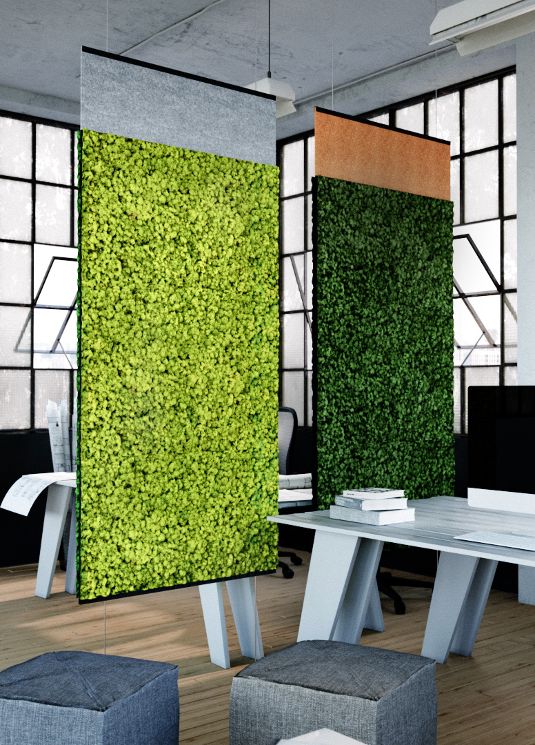 The lichen-covered screens feature excellent acoustic qualities and embody the visual healing benefits of the natural world. They are perfect for placement in office spaces, meeting rooms, hallways and commercial lobbies.
