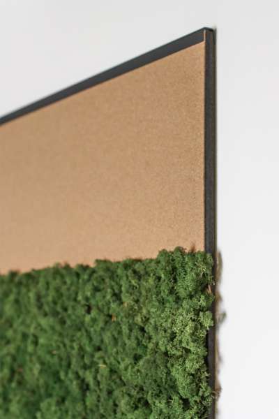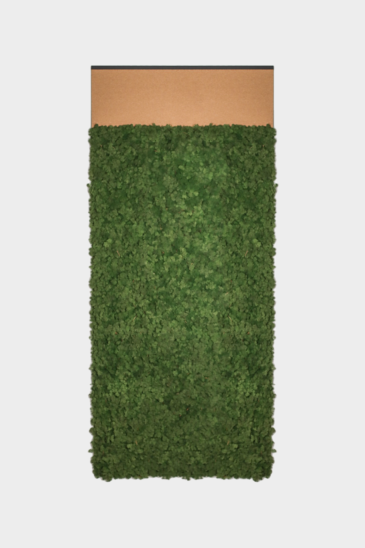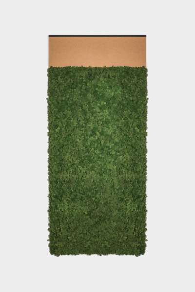 The Hyphen is a flat rectangular wall panel covered with preserved Lichen (reindeer moss). The moss is available in different shades for contrasting decorative arrangements. Each product comes with a choice of a cork or felt finish, which can be seen at the very top of the vertically aligned panel.