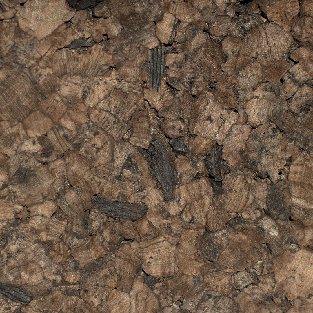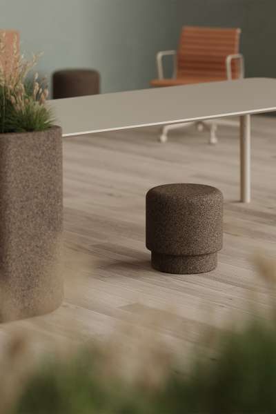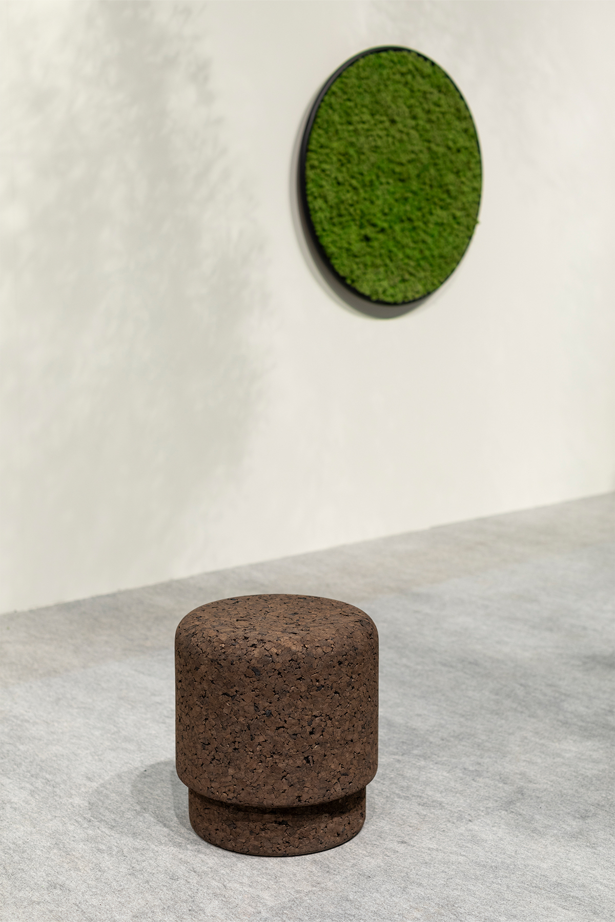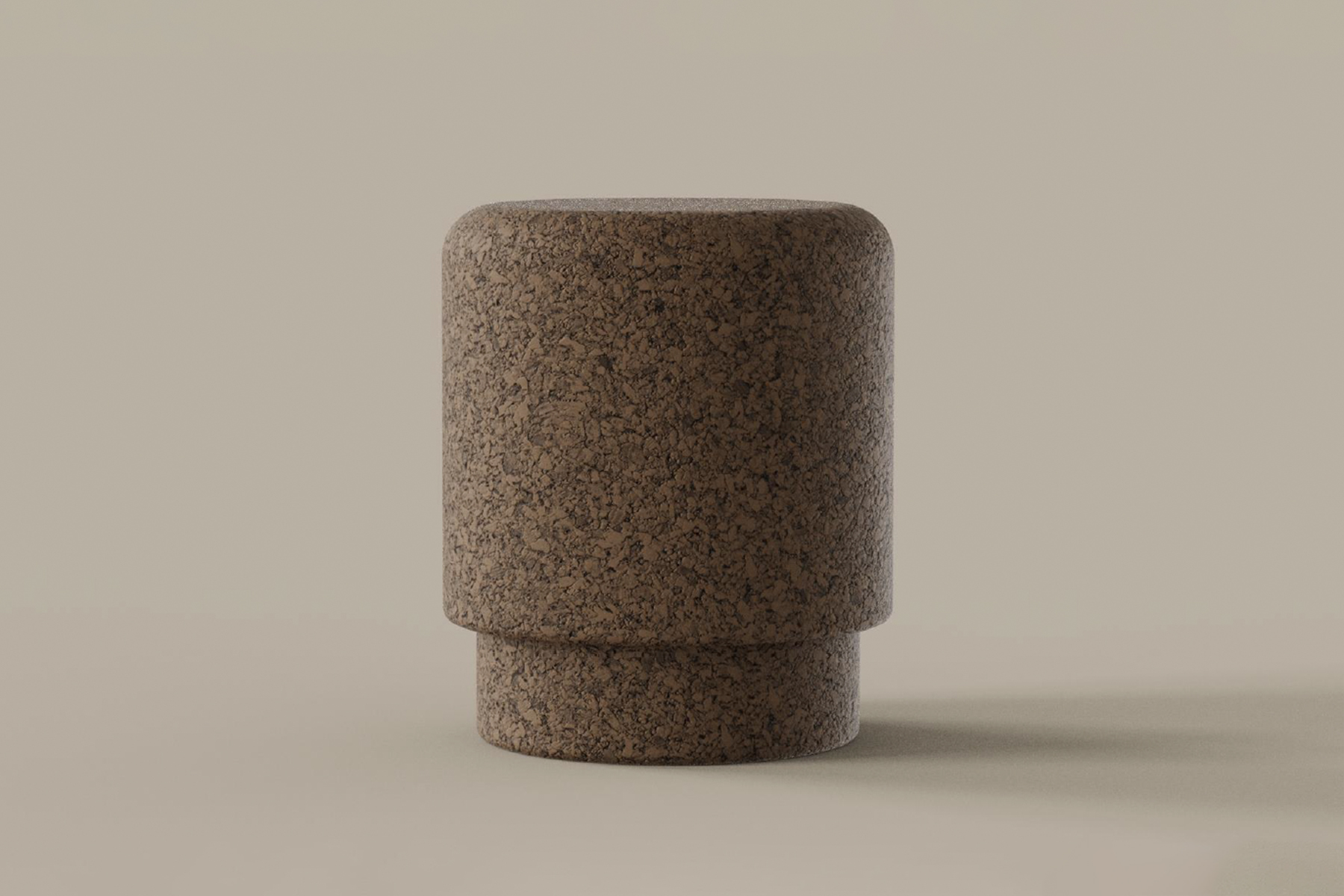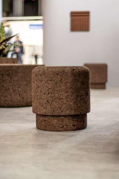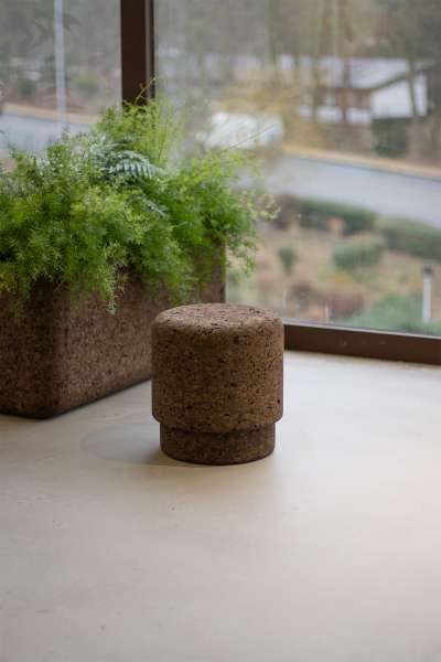 The Mario Poufs are made fully out of expanded cork blocks, also sometimes called smoked cork. Expanded cork is itself, in a way, a byproduct of the traditional cork industry. Expanded cork is made from the bark of the cork tree that is of too poor quality to be used for producing wine corks. It is manufactured from the cork bark of the upper branches of the cork oak tree. This bark is normally left, due to it being too thin or too inconsistent to use in traditional cork products. It is then turned into cork granules that are steam-heated, which causes them to expand and activate the suberin, the resin in the cork, that will naturally bind them together into large blocks. Hence, no binding material needs to be added to produce expanded cork. Thanks to its open cells, expanded cork holds excellent acoustic properties.