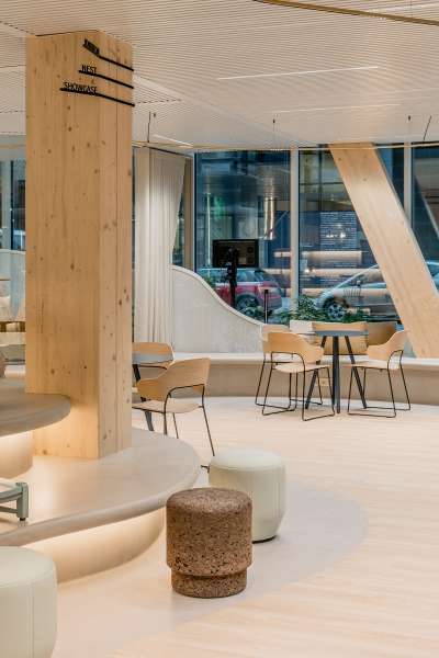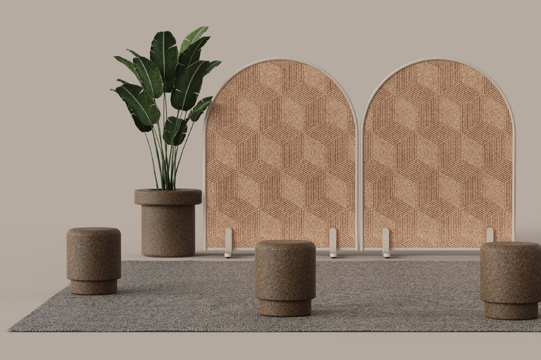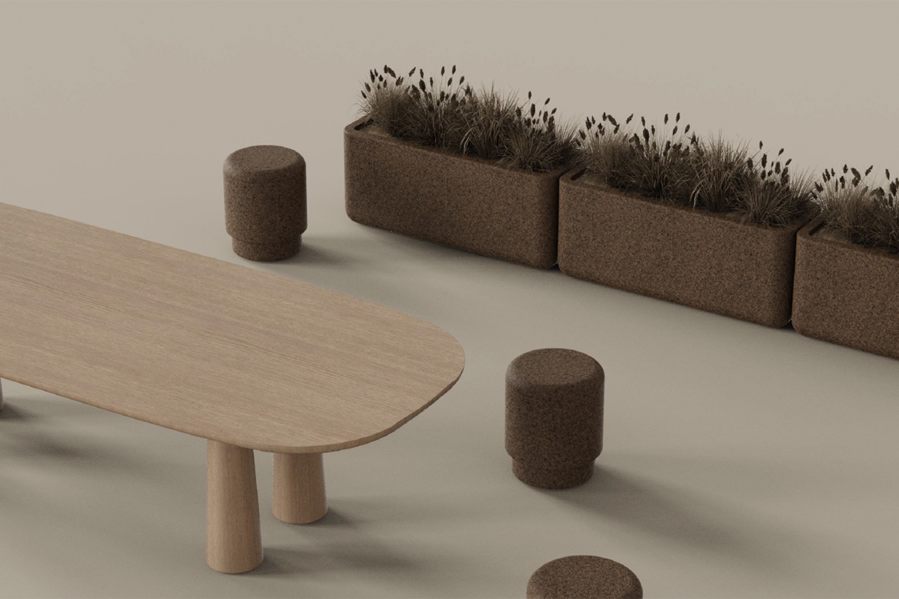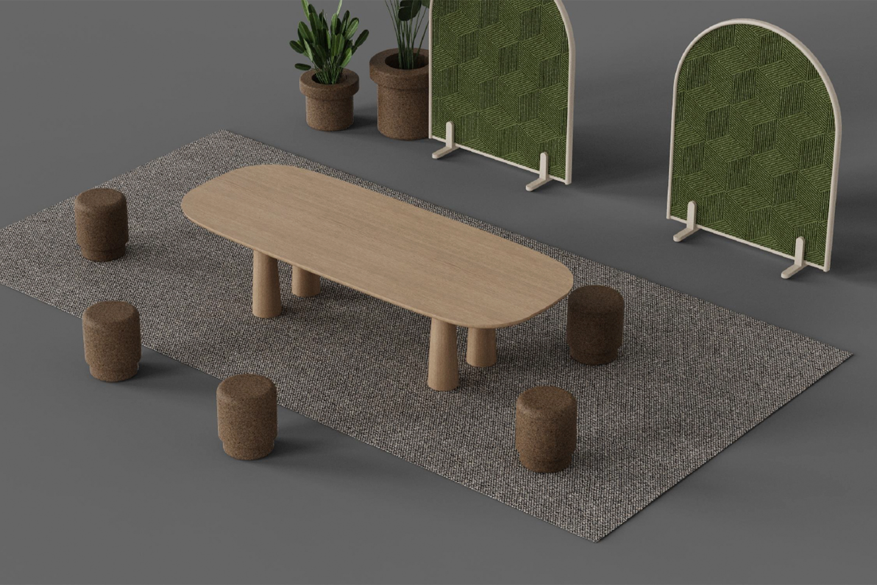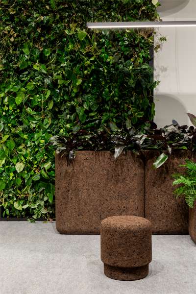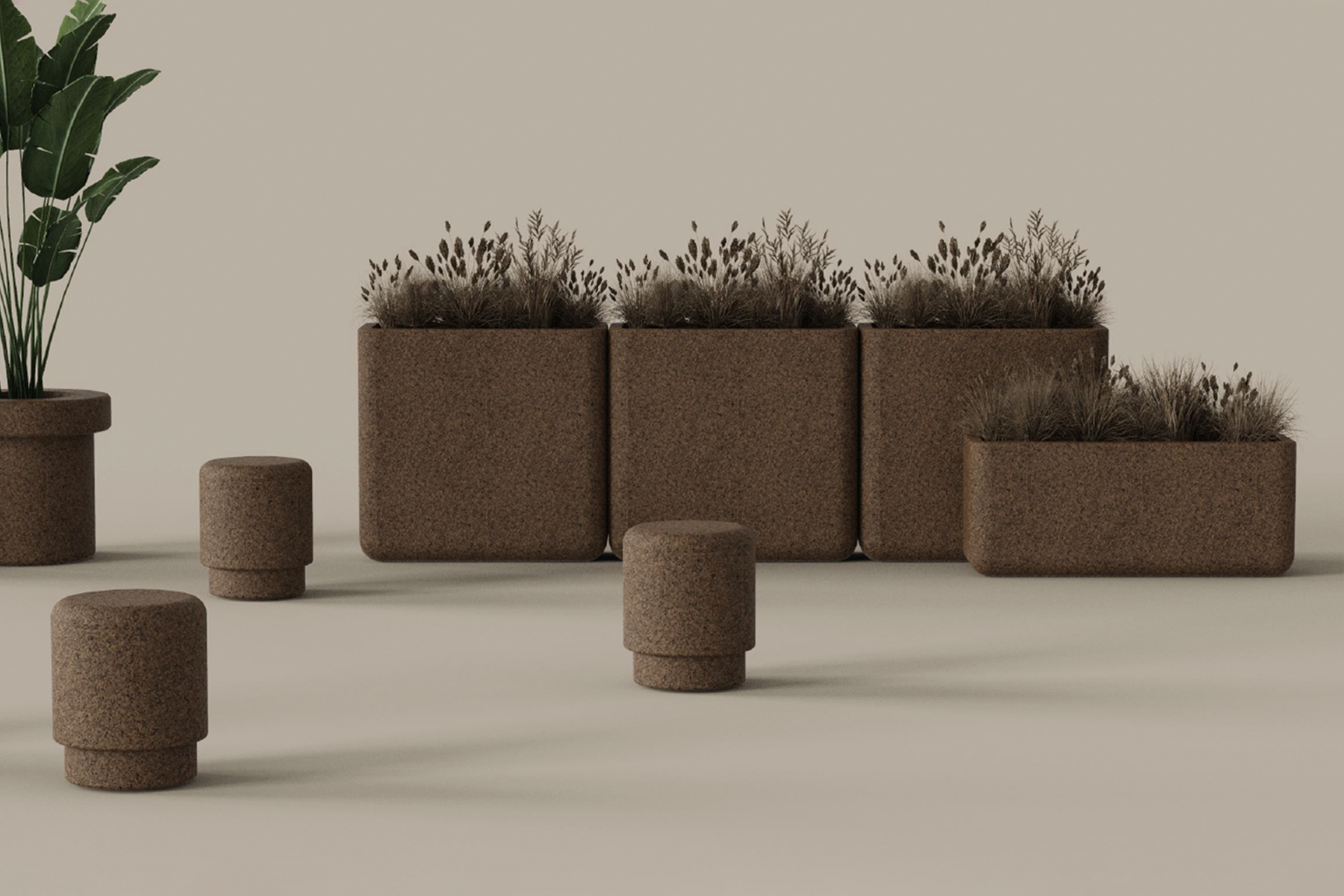 The Mario Poufs are made fully out of expanded cork blocks, also sometimes called smoked cork. Expanded cork is itself, in a way, a byproduct of the traditional cork industry. Expanded cork is made from the bark of the cork tree that is of too poor quality to be used for producing wine corks. It is manufactured from the cork bark of the upper branches of the cork oak tree. This bark is normally left, due to it being too thin or too inconsistent to use in traditional cork products. It is then turned into cork granules that are steam-heated, which causes them to expand and activate the suberin, the resin in the cork, that will naturally bind them together into large blocks. Hence, no binding material needs to be added to produce expanded cork. Thanks to its open cells, expanded cork holds excellent acoustic properties.