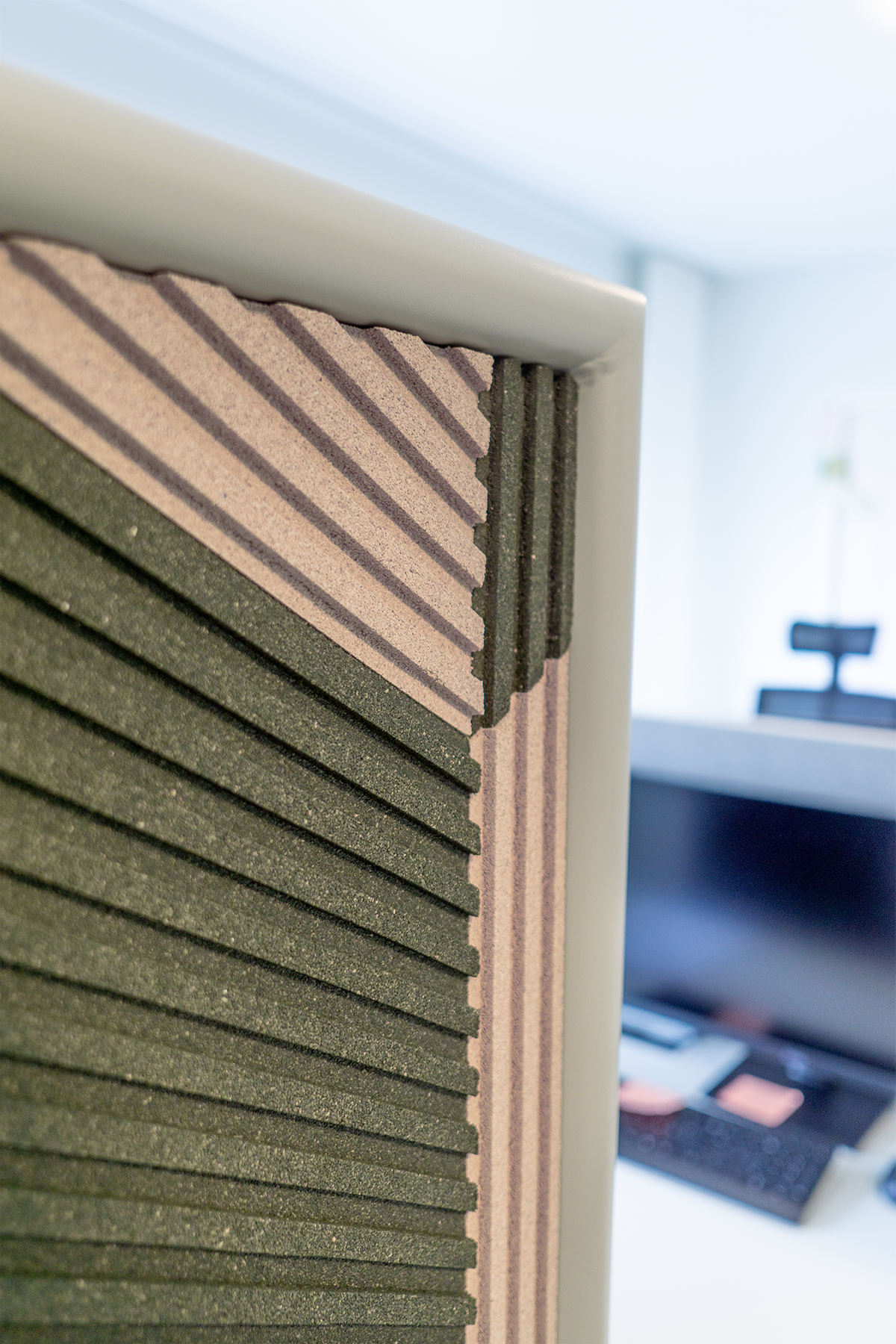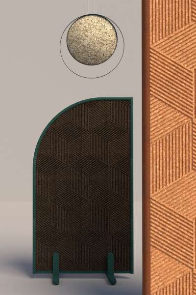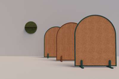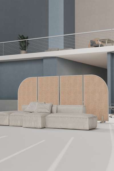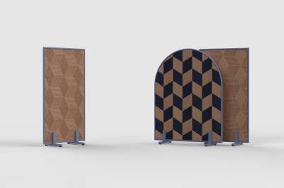 The Modulor Cork is a double sided acoustic room divider, composed of two panels, made of cork, attached to a free-standing metal framework.