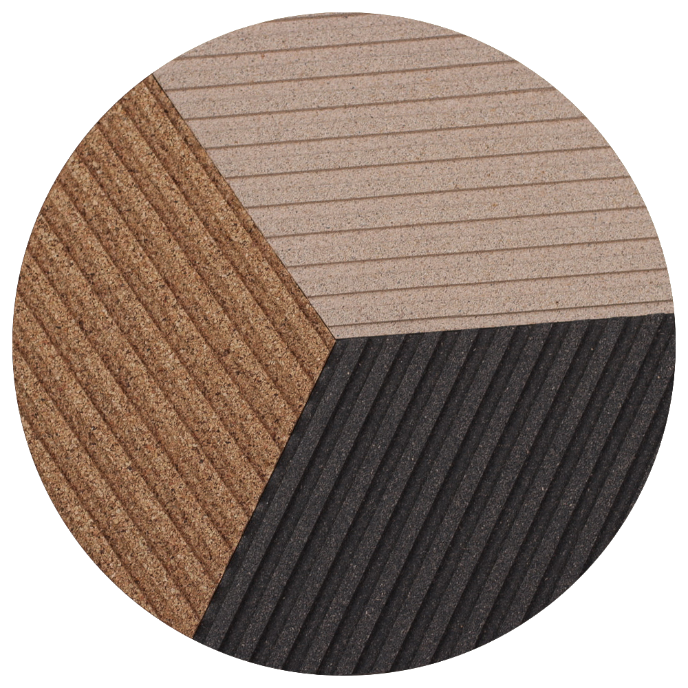 All the cork colors have been inspired by natural elements. Our three colored pattern, PAT.07, creates a fascinating 3D optical illusion, adding visual dynamism to the interior. For those, who seek something calmer, there are various natural tones and plain patterns to choose from.